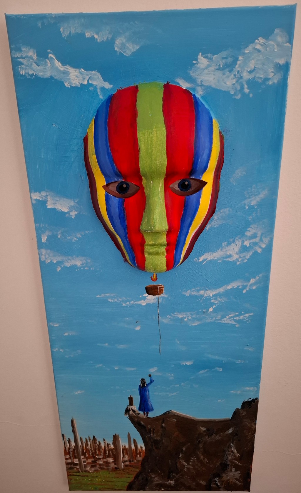 By Aleksey | DustyStains Published on January 26, 2026A ballon mask looking at the viewer over landscape30 x 70 CMat an angle view: