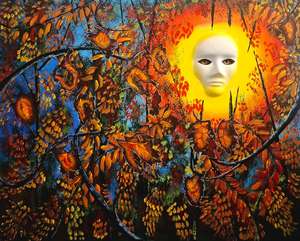 The mask is embedded into the image with a modeling paste so it is very much a part of the canvas. The painting was done by creating a full female face and then covering it with mask and landscape elements.